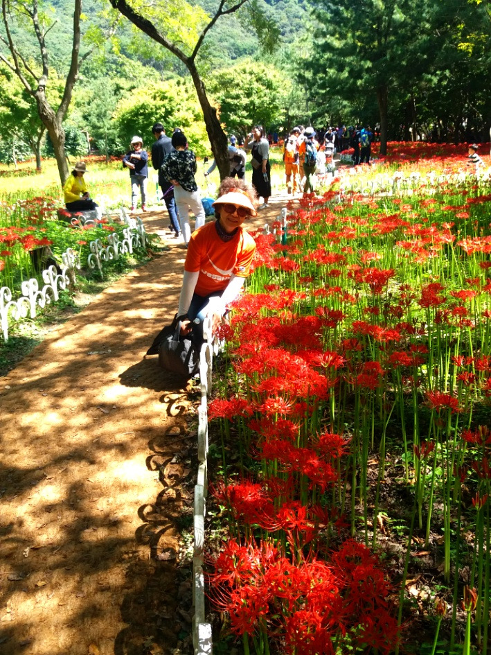지금까지 한 번도 보지 못한 상상화꽃을 보기 위하여 불갑사로 향하였다. 새로 잘 만들어진 도로 곳곳에 상상화 축제장으로 가는 표시판이 설치되어 있는데 처음에는 이해가 잘 가지 않았다. 딴에는 일찍 구경하고 올라가자고 서들 었는데 불갑사 진입로가 어데인지 모르지만 차가 밀리기 시작하는데 작안이 않이었다. 축제장에 ㄷ가녀본 경험이 없는 무식한 사람의 판단이라 실수를 하고 만 것이다. 사람들이 이리 많이도 모여들까? 대한민국 차라는 차는 다 모여든 모양이다. 얼마나 걸여 불갑사에서 자그마치 6km도 더 떨어진 곳에다 차를 대놓고 아들과 같이 걷고 또 걷는다. 행사장에 도착했을 때는 기진맥진이다. 가을 뙤약볕을 받으며 아들과 같이 사람 속에 묻혀서 손을 잡고 걷고 또 걸은 것이 힘들어 본인다기보다는 행복이 겨운 것이 않인가?