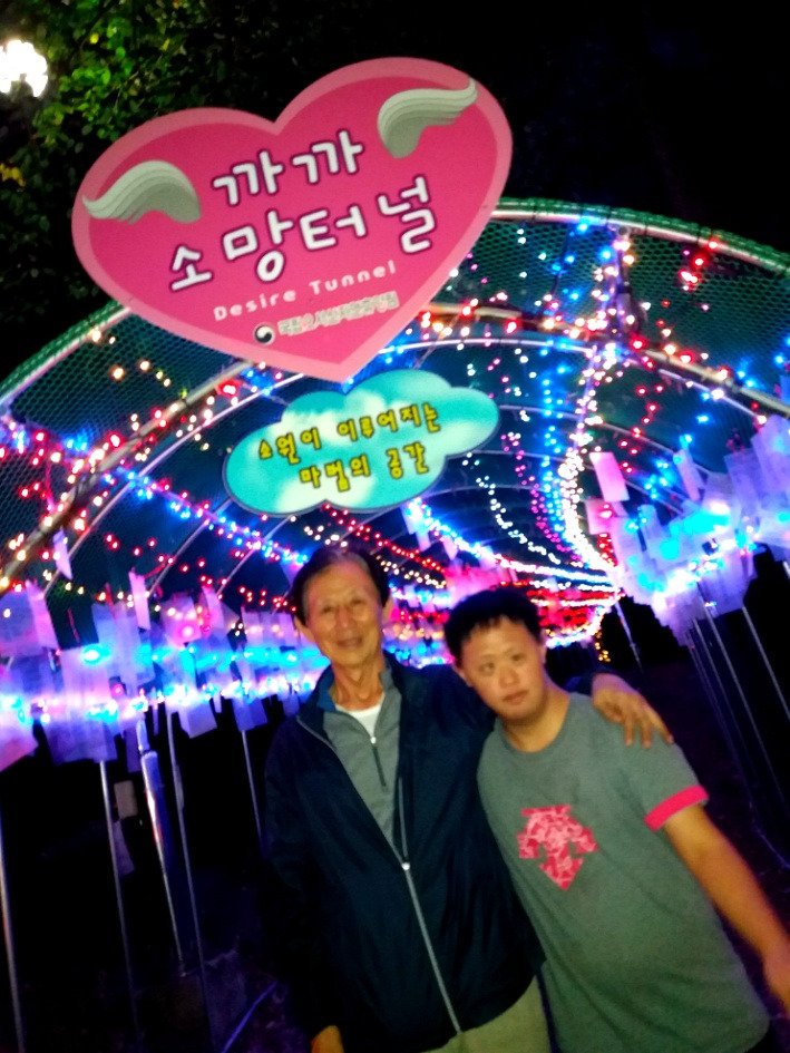 산책로를 한바퀴 돌아오니 어둠이 깔렸는데 숙소 앞에 아름다운 조명이 설치된 곳이 있어 아들과 같이 기년 사진 한 장을 남기고 숙소로 들어와 숙소 안에서 프라이팬에 고기를 구워 술 한잔을 하면서 내일의 일정을 짜고 있는데 집사람이 전화를 받는다.