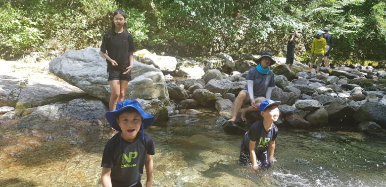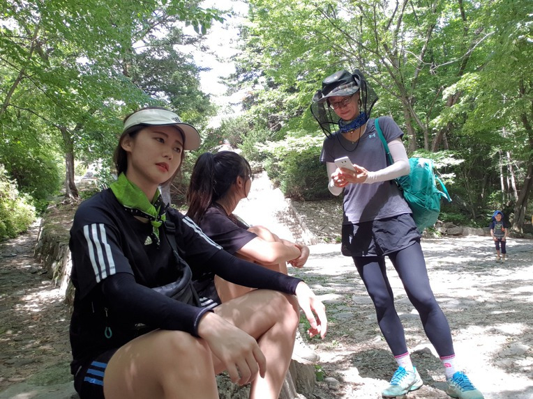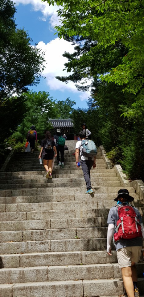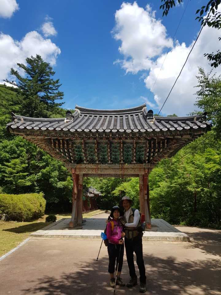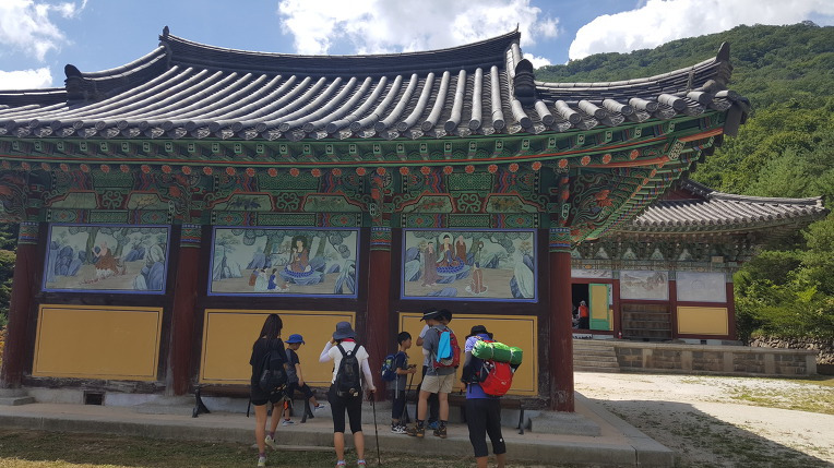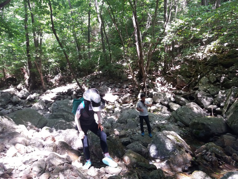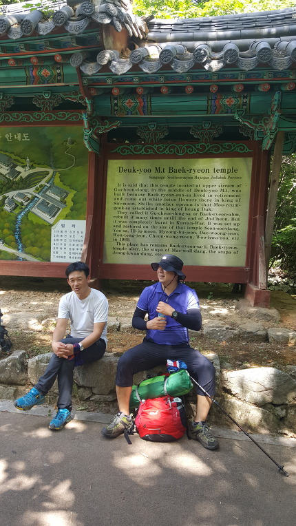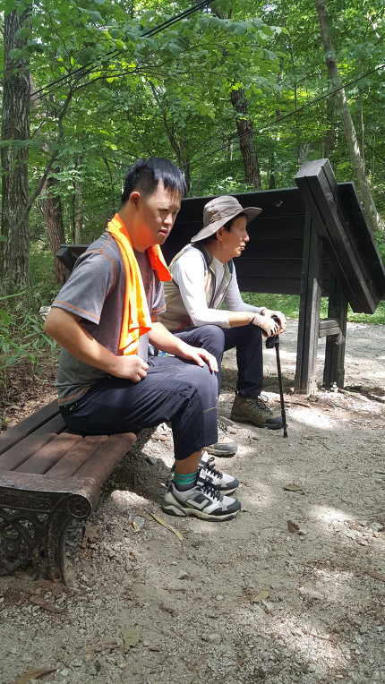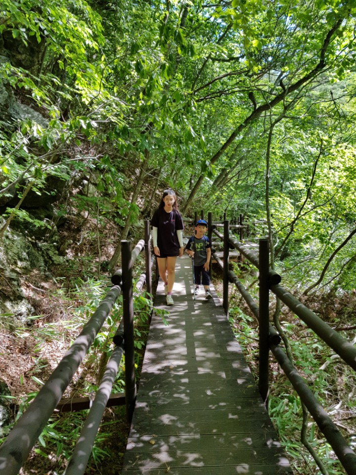 승용차 세대로 끈딸 가족만 분산하고 등산길을 나선 것이다. 큰사위만 빠지고 모두 참여한 여행이었다.집에서 출발할 때는 새벽 6시지만 열대야 현상으로 자동차 계기판 온도계가 29도로 표시되었는데 구천동 가까이 가자 26도로 내려가 있었다. 가는 도중 휴게소를 들여 쉬었다 가다 보니 구천동에 8시 반경 도착하여 9시부터 삼삼오오 짝을 지어 자유스럽게 탐방로를 따라 오르기 시작한다.